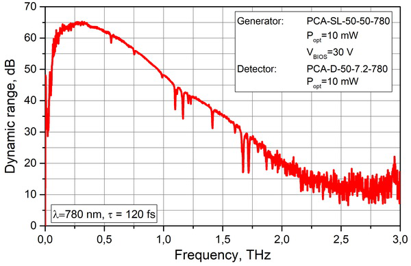 我们的PCA-SL-50-50-780 和 PCA-D-50-7.2-780 构成了一对理想的天线,基于此可以构建宽带太赫兹光谱仪,该光谱仪能够测量 Δf 在 0.1 至 2.2 THz 之间的频率范围(Δλ 为 3000 至 130 μm)。